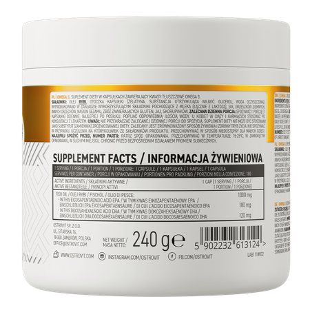 OstroVit Omega 3 nodrošina būtiskas taukskābes ērtās šķeltajās kapsulās — katra kapsula satur 1000 mg zivju eļļas ar 180 mg EPA un 120 mg DHA. Tie ir būtiskie taukskābes, ko organisms pats nespēj ražot, taču tās ir vitāli svarīgas sirds, smadzeņu un kognitīvās veselības normālai darbībai. Pieejams Omegafit.ee interneta veikalā no Pērnavas, Igaunijā, piegāde 1-2 dienās uz Latviju.