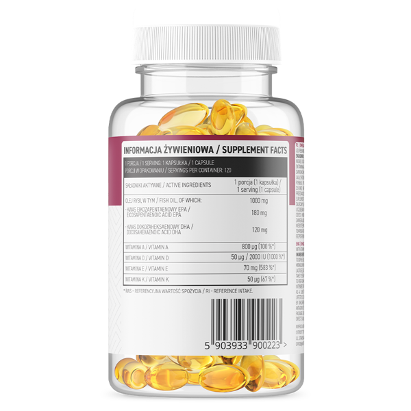 Pilnīgs risinājums ikdienas veselībai — OstroVit Omega 3 + ADEK apvieno omega-3 taukskābes ar taukušķīstām vitamīniem (A, D, E, K) vienā kapsulā. EPA (180 mg) un DHA (120 mg) ir būtiskas taukskābes sirds un smadzeņu funkciju atbalstam, savukārt taukušķīstajiem vitamīniem ir nepieciešamas taukskābes, lai nodrošinātu optimālu uzņemšanos. Pieejams Omegafit.ee interneta veikalā no Pērnavas, Igaunijā, piegāde 1-2 dienās uz Latviju.