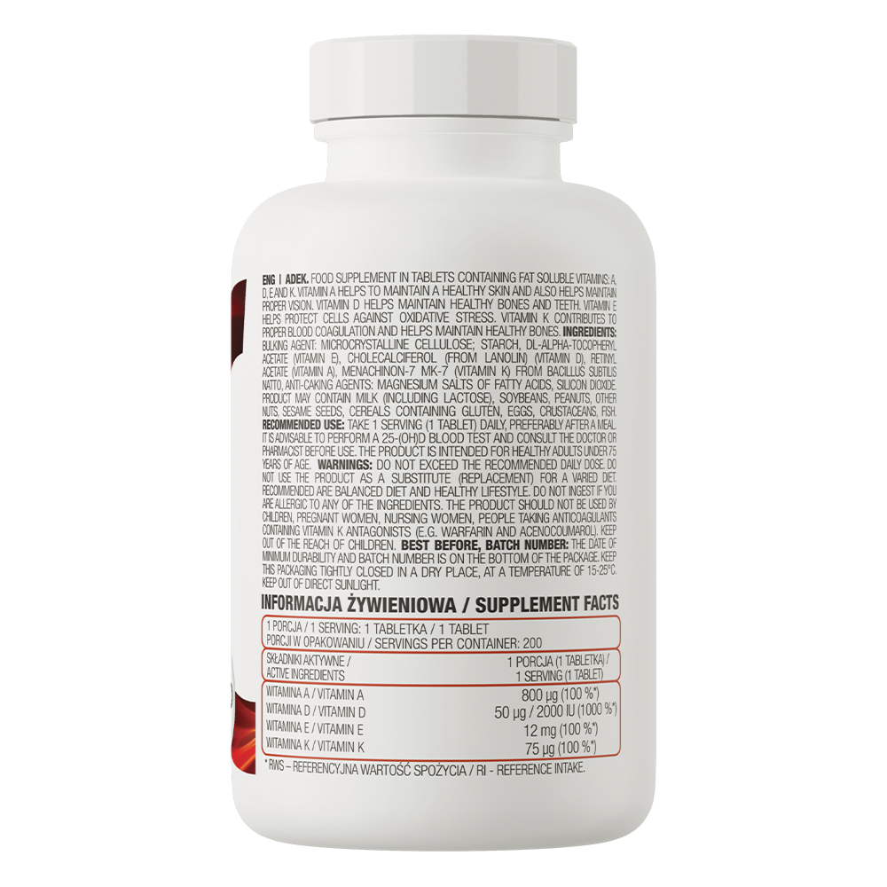 OstroVit ADEK 200 tabletas ir uztura papildinājums, kas satur četrus taupstarojamos vitamīnus: A, D, E un K. Vitamīns A veicina veselīgas ādas uzturēšanu un normālu redzi. Vitamīns D veicina veselīgu kaulu un zobu uzturēšanu. Vitamīns E pasargā šūnas no oksidatīvā stresa, bet vitamīns K veicina normālu asins s coagulation procesu un palīdz uzturēt veselīgus kaulus. OstroVit ADEK ir visaptverošs komplekss, kas izstrādāts personām ar palielinātām taupstarojamo vitamīnu vajadzībām.