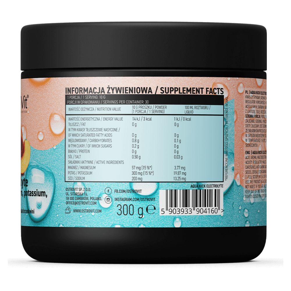 OstroVit Aqua Kick Electrolyte 300g – elektrolīti ir būtiskas minerālvielas, kas ieņem izšķirošu lomu dažādu ķermeņa funkciju uzturēšanā, īpaši regulējot šķidruma līdzsvaru, atbalstot nervu sistēmu un muskuļu funkcijas. Veicot fiziski exigējošas aktivitātes vai izraisot pārmērīgu šķidruma zudumu através svidrāšanas, ir nepieciešams papildināt šos elektrolītus, lai novērstu dehidratāciju un saglabātu kopējo pašsajūtu.