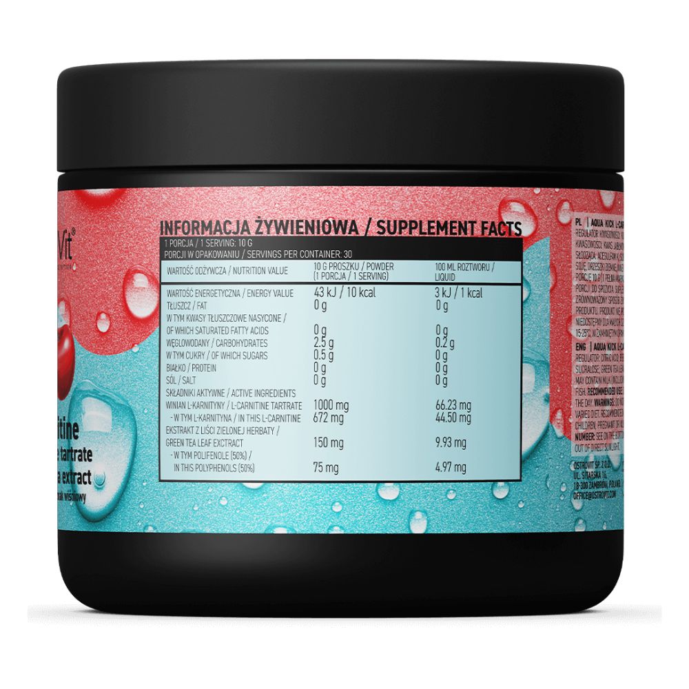 OstroVit Aqua Kick L-Carnitine 300g ir ūdensšķīstams pulveris ar skābā konfekta garšu, kas satur L-karnitīna tartrātu un zaļās tējas ekstrakts. Tas atbalsta tauku metabolismu treniņa laikā, un patīkamais garšas attiecība kalpo kā aizstājums saldajiem dzērieniem. Pieejams Omegafit.ee interneta veikalā no Pērnavas, Igaunijā, piegāde 1-2 dienās uz Latviju.