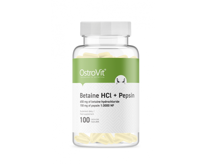 OstroVit Betaine HCl + Pepsin ir uztura bagātinātājs ar augstu pepsīna un betaīna hidrohlorīda saturu. Uztura bagātinātāja sastāvdaļām ir regulējoša ietekme uz kuņģa skābes līmeni, tādējādi uzlabojot gremošanas procesu.