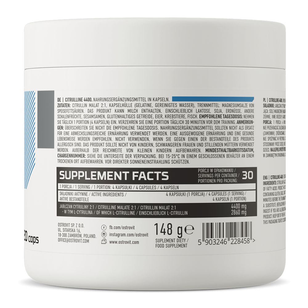 OstroVit Citrulline 4400 mg 120 kapsulas – augstas kvalitātes uztura bagātinātājs kapsulās, kas satur citrulīna malātu attiecībā 2:1, kas cita starpā palīdz aizsargāt muskuļus no noguruma un atjaunot pilnīgu spēku pēc smagiem, intensīviem treniņiem. Palielinot slāpekļa oksīda sintēzi, tas arī nodrošina labāku asinsriti un ievērojami labāku skābekļa un barības vielu transportēšanu uz šūnām.