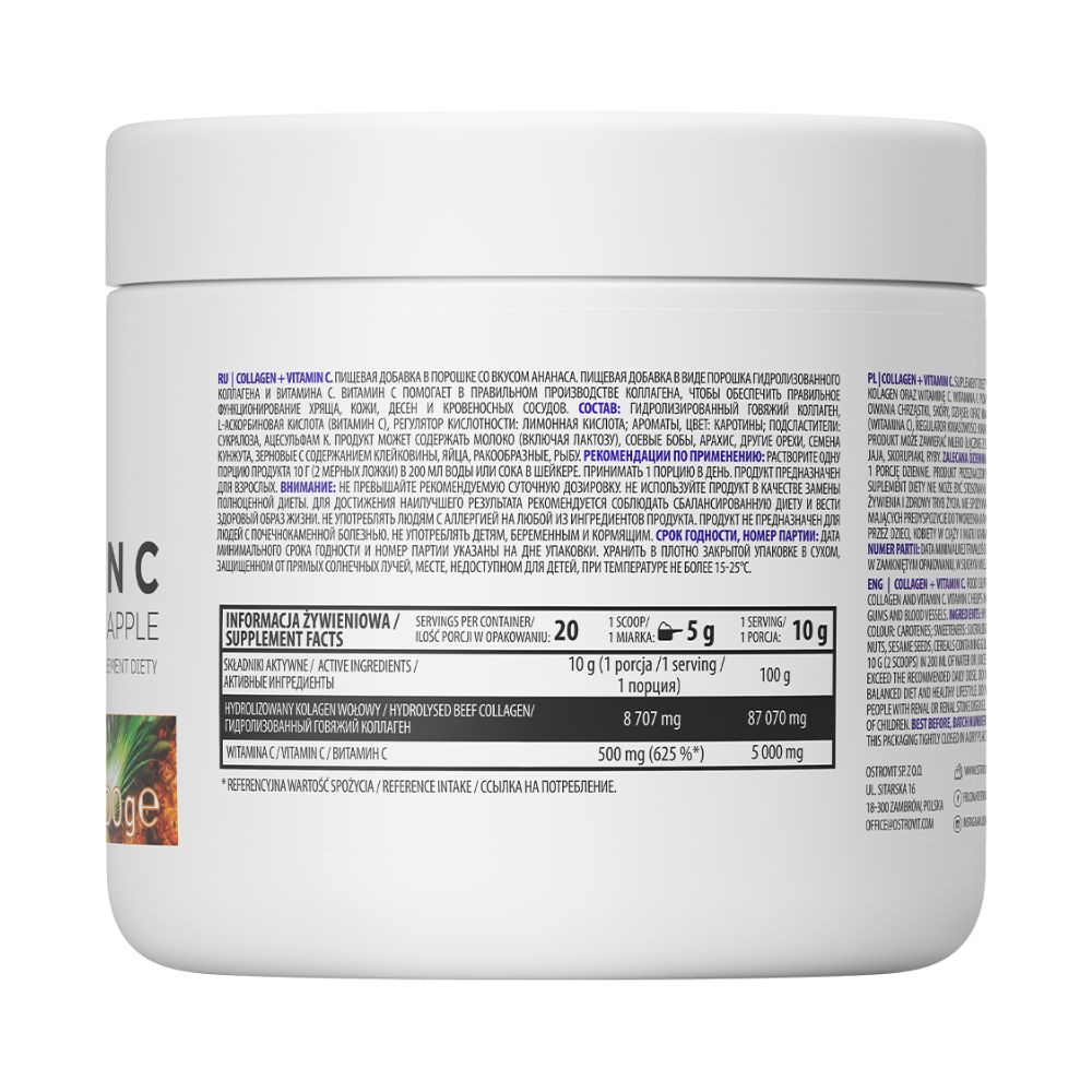 OstroVit kolagēns + C vitamīns 200 g — ir augstas kvalitātes uztura bagātinātājs, kas satur hidrolizētu liellopu kaulu kolagēnu un vērtīgo L-askorbīnskābi. Tas ir pulverveida preparāts, kas pieejams dažādās garšās un ir ideāli piemērots gan fiziski aktīvu cilvēku, gan to cilvēku ikdienas uztura papildināšanai, kuri rūpējas par savu veselību un skaistu izskatu.