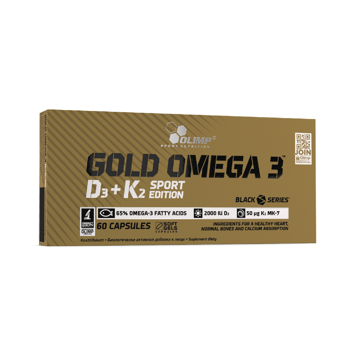 Olimp Gold Omega 3 D3+K2 Sport Edition katrā mīkstajā kapsulā ir 1000 mg koncentrētas aukstā ūdens zivju eļļas, kas standartizēta līdz 65% omega-3 taukskābju, tostarp 330 mg EPA un 220 mg DHA. Formula ir bagātināta ar 2000 SV D3 vitamīna un menahinona-7 (MK-7, dabīgs K2 vitamīns no natto), kas atbalsta sirds un asinsvadu veselību, imūnsistēmas darbību, kalcija metabolismu un kaulu integritāti. Viena kapsula jālieto katru dienu ēdienreizes laikā.